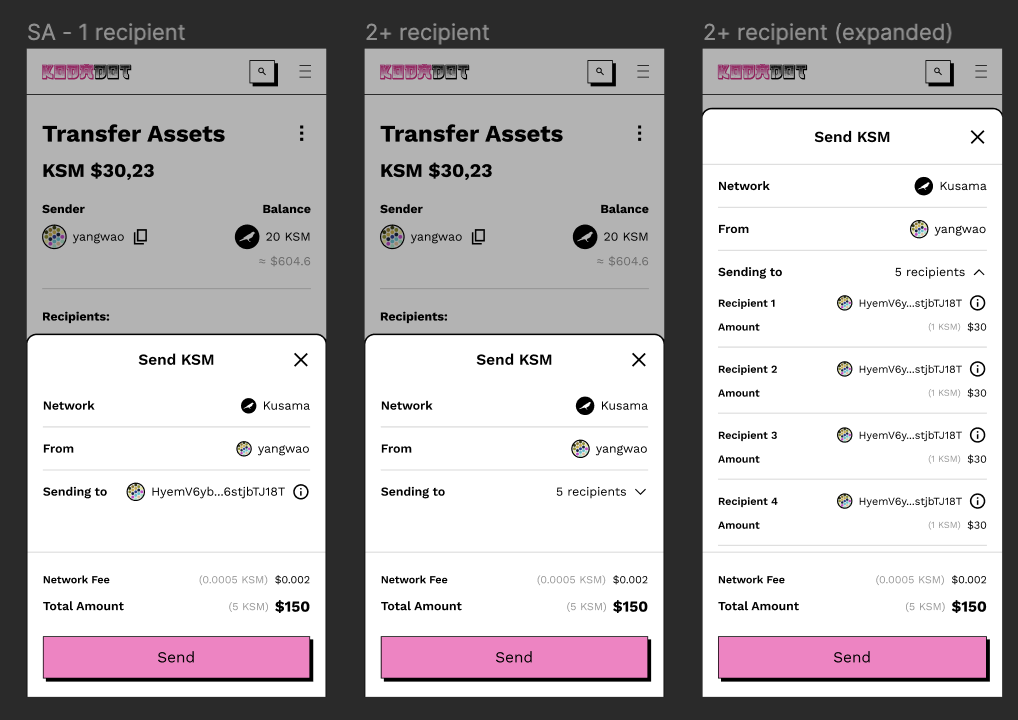 We've processed **over $500k through our transfer dialogue** based on past dispatched payrolls. These days we are reworking the transfer flow; in the future, it will be a fully-fledged app for your web3 team to use natively. Currently **supported currencies are $KSM, $DOT and there will be support for $USDT in the future.** If you want to use KodaDot Transfer, feel free to do so! -  <https://kodadot.xyz/dot/transfer/>